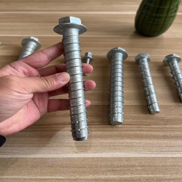 Zinc-Plated Carbon Steel Concrete Bolts M10 x75mm a cutting thread is arranged around the threaded part, and the cutting thread extends from the end of the threaded part close to the straight rod part to the end of the threaded part far from the straight rod part, and the cutting thread forms several circles of protrusions on the threaded part teeth, a “”V””-shaped groove is opened between the adjacent two circles of protruding teeth, and the “”V””-shaped groove is spirally arranged around the threaded portion and extends along the cutting thread track.